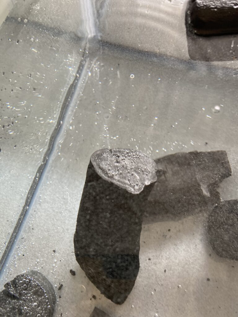 この動画を見て分かるように、通常ラオス備長炭には多くの空気が含まれていて、水に浸けることでその空気が吐き出されていくんですね。ということは、吐き出した空気と同じ分量の水が備長炭の中に取り込まれたということになります。