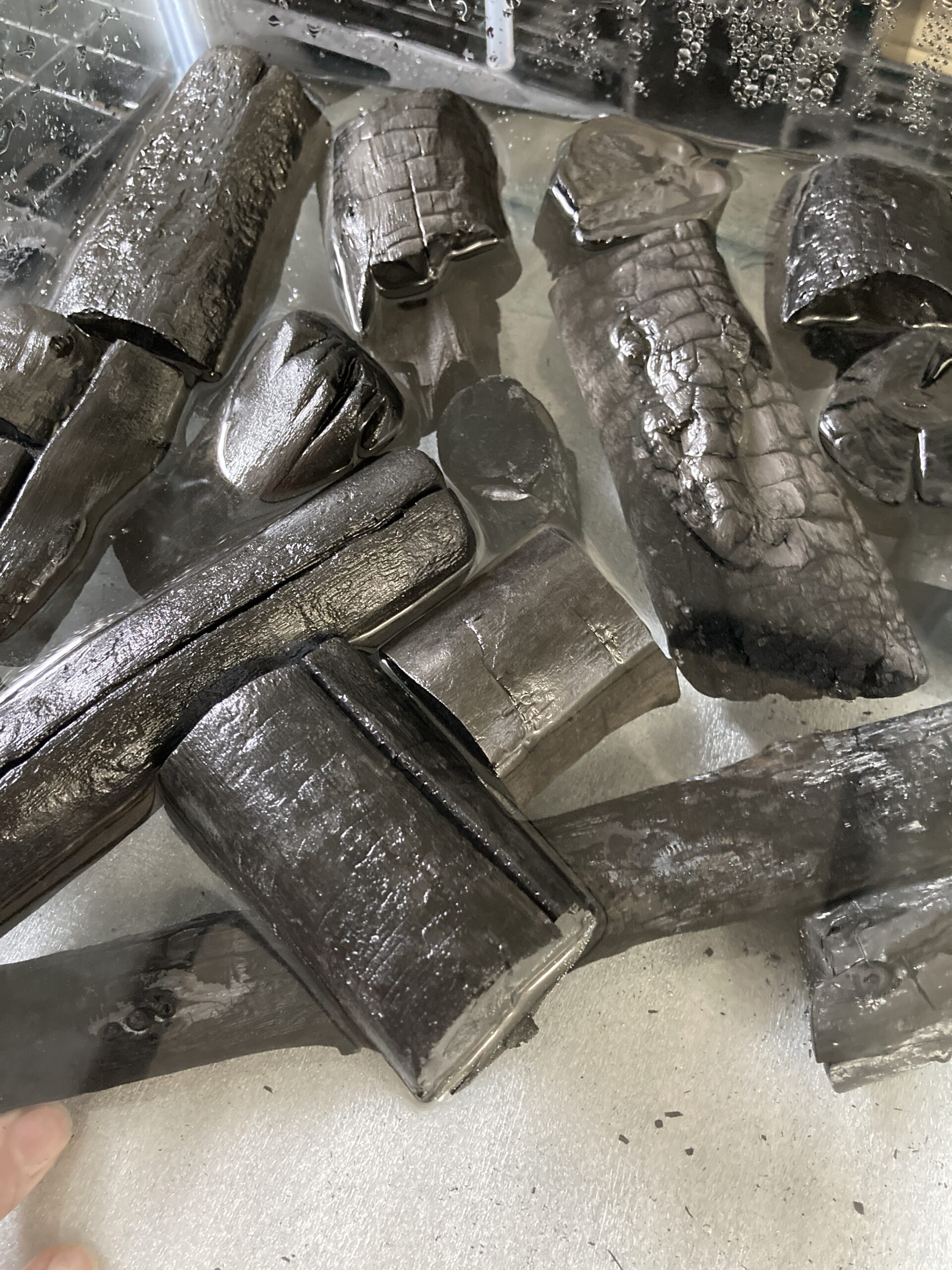 もう一点この実験から分かることがあります。完全に水に沈んだラオス備長炭(三日ほど水中に放置したもの)を取り出して、これを電動ノコギリで切断してみると、なんと切断面も濡れているではありませんか!😳