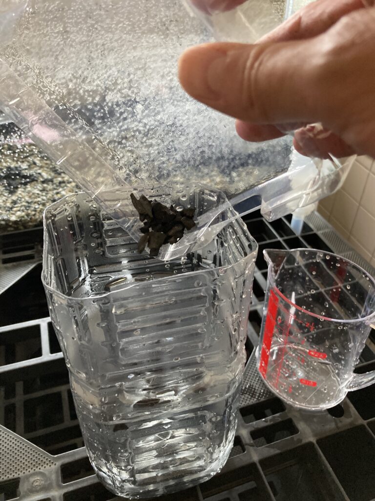 それはそうと、ここまでの実験でちょっと失敗があったと思い、ここで一旦振り出しに戻すことにしました。その失敗とは、備長炭の粒を洗わずに入れてしまった為に水が黒いままになってしまったということです笑
