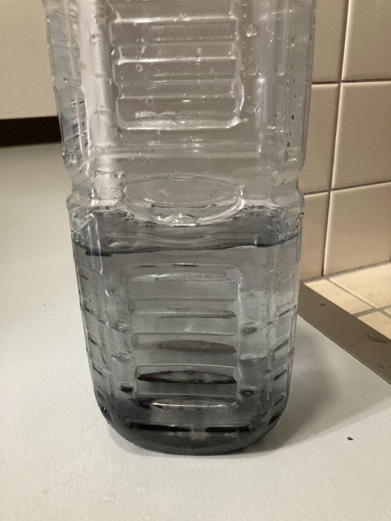 予想通り炭の粉は沈澱していてだいぶ透き通っています。ただ、完全に透明かと言われるとそうではなくて、まだまだ目に見える黒さがあります。